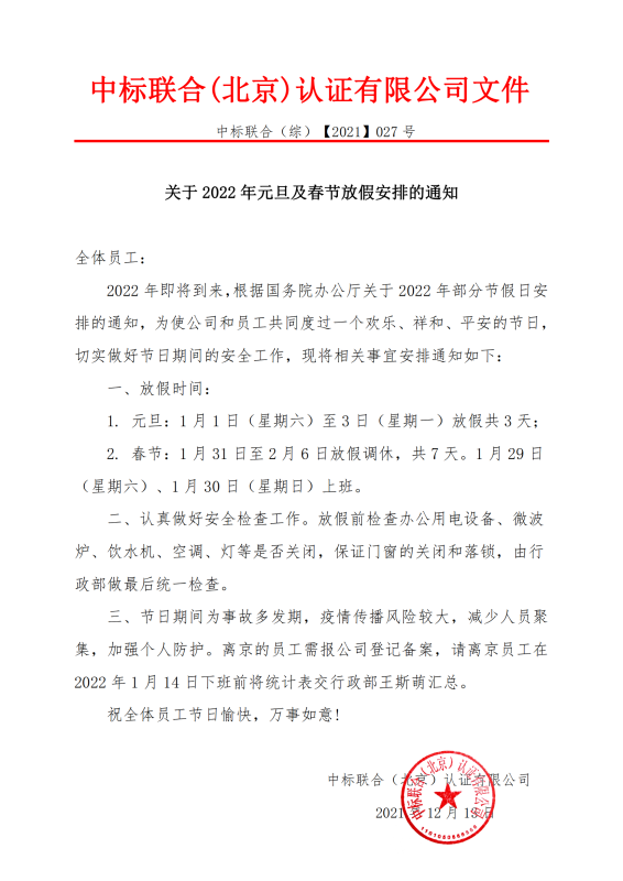 關于 2022 年元旦及春節放假安排的通知