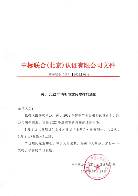 關于2022年清明節(jié)放假安排的通知