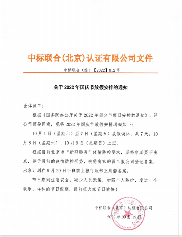 關于2022年國慶節放假安排的通知